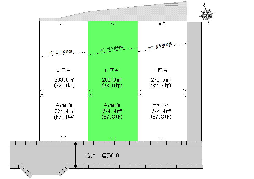 | 接道状況 | 一方 (南側 公道6.0m 間口9.6m) | ||