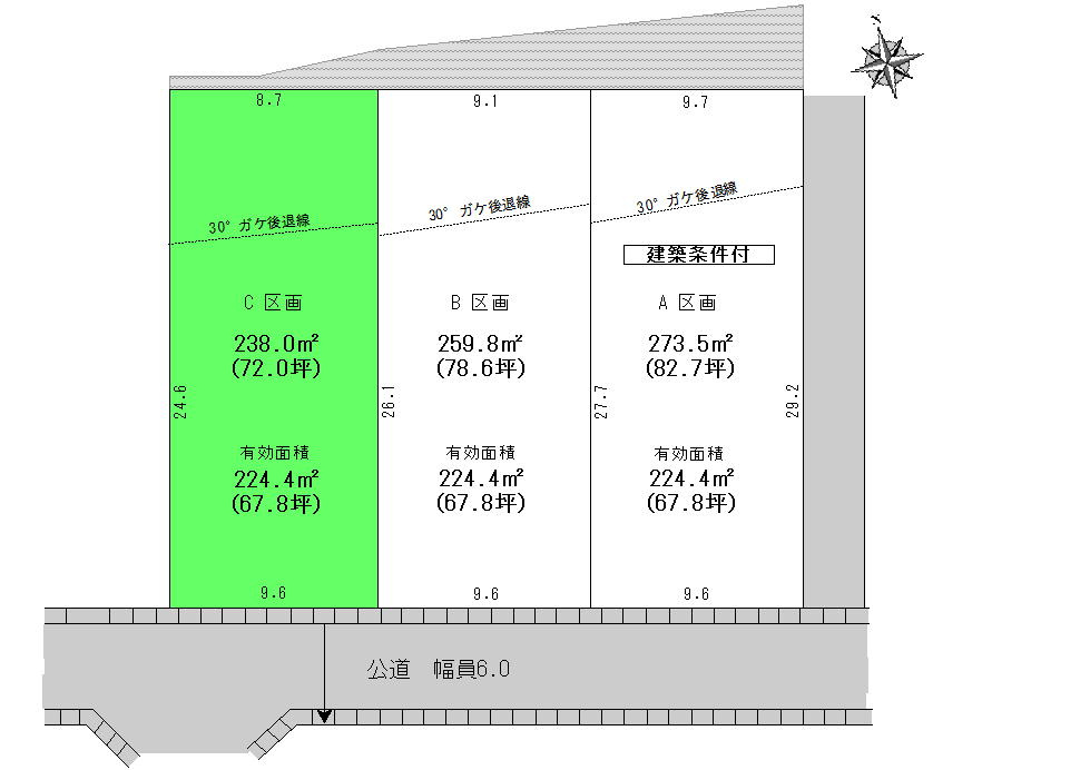 | 接道状況 | 一方 (南側 公道6.0m 間口9.6m) | ||